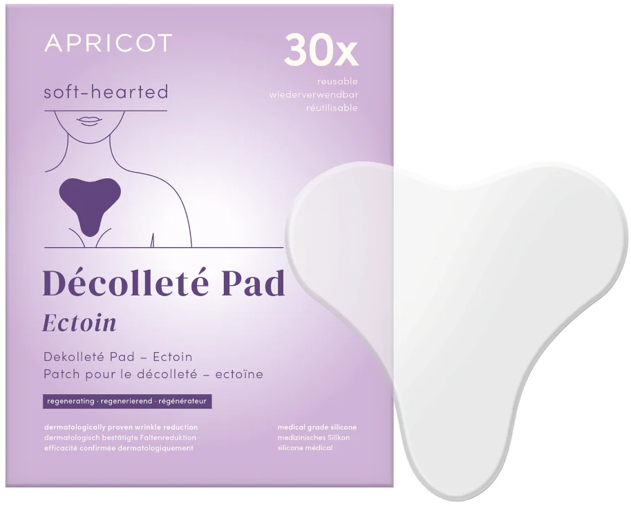 Mit dem Ectoin Dekolleté-Pad von APRICOT pflegst du trockene Haut im Dekolletébereich. Es besteht aus medizinischem Silikon und ist mit natürlichem Ectoin angereichert, wodurch Linien und Fältchen geglättet werden können. Das Pad kann bis zu 30x wiederverwendet werden.