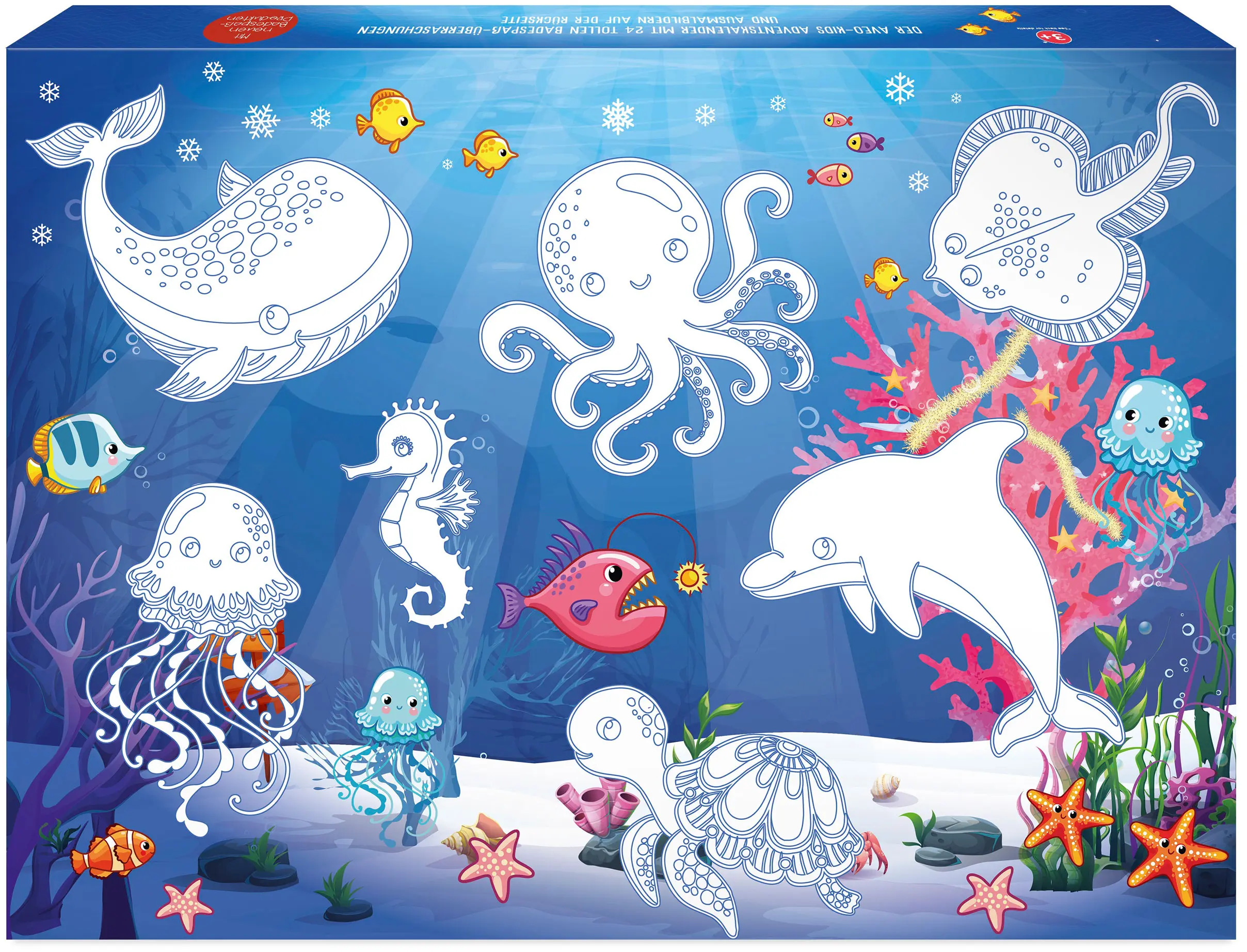 Hier ist Badespaß vorprogrammiert. Hinter 24 Türchen warten Badekugeln, Badeschleim, Knister-Salz und vieles mehr. Damit wird das Warten aufs Weihnachtsfest im Nu verkürzt. Auf der Rückseite des Kalenders befinden sich außerdem fröhliche Ausmalbilder, um die Zeit des Wartens zusätzlich zu vertreiben.