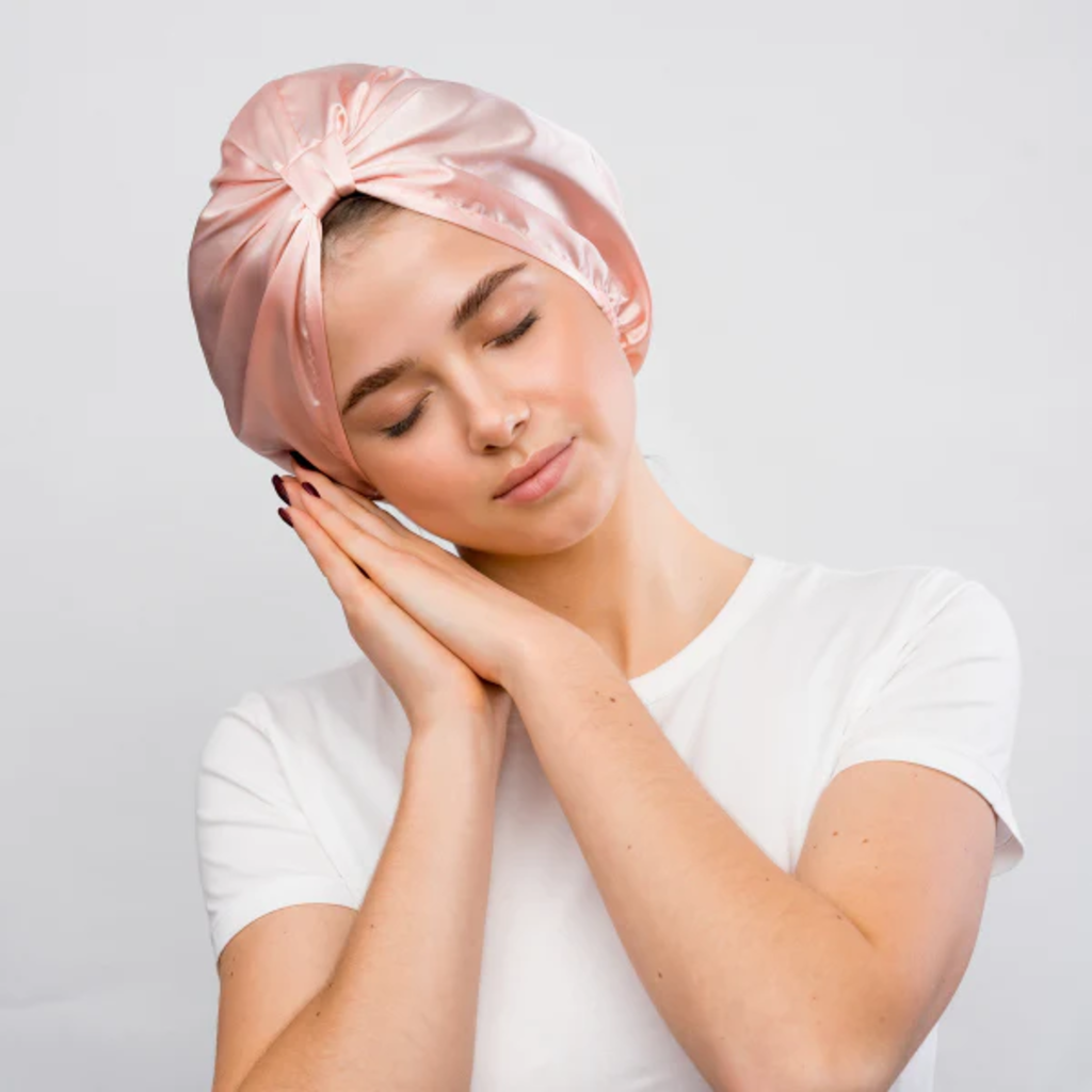 - Ziehe nun den Vorderteil des Satin Bonnets über dein Haar und stelle sicher, dass alle Strähnen darunter liegen.