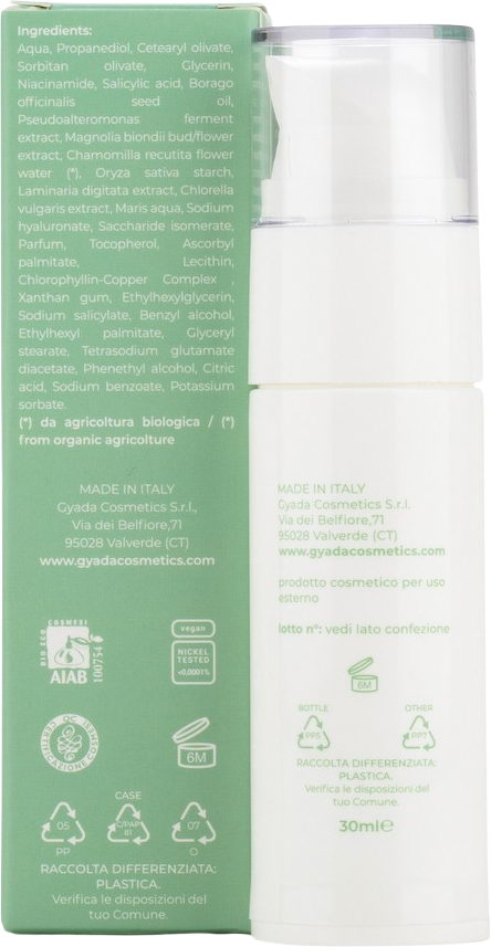 Aqua, Propandiol, Cetearyl Olivate, Sorbitan Olivate, Glycerin, Niacinamide, Salicylic Acid, Borago Officinalis (Borage) Seed Oil, Pseudoalteromonas Ferment Extract, Magnolia Biondii Bud/Flower Extract, Chamomilla Recutita Flower Water[1], Oryza Sativa (Rice) Starch, Laminaria Digitata Extract, Chlorella Vulgaris Extract, Maris Aqua (Sea Water), Sodium Hyaluronate, Saccharide Isomerate, Parfum, Tocopherol (Vitamin E), Ascorbyl Palmitate (Vitamin C), Lecithin, CI 75810 (Chlorophyllin-Copper Complex), Xanthan Gum, Ethylhexylglycerin, Sodium Salicylate, Benzyl Alcohol, Ethylhexyl Palmitate, Glyceryl Stearate Se, Tetrasodium Glutamate Diacetate, Phenylethanol, Citricacid, Sodium Benzoate, Potassium Sorbate