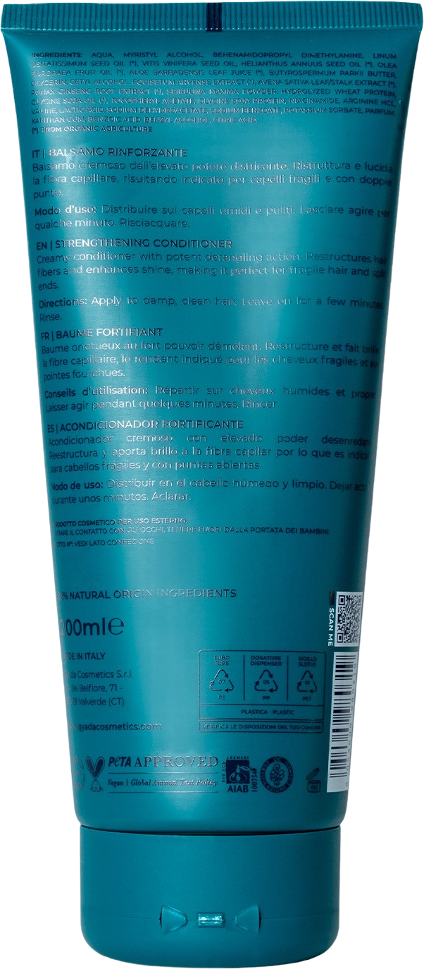 Der stärkende Balsam von GYADA Cosmetics restrukturiert brüchiges, splissiges Haar und schenkt ihm neuen Glanz. Er besitzt überdies einen weichmachenden Effekt, der hilft, selbst das rebellischste Haar zu entwirren. Das Produkt enthält Spirulina (Meeresalgen, die reich an Mineralsalzen, Vitaminen und Aminosäuren sind), die in Synergie mit Ginseng, Hafer und Schachtelhalm wirken. Die weiters enthaltenen Aktivstoffe, wie Aloe Vera, Weizenproteine und Pflanzenöle, helfen dabei, einen natürlichen Schutzfilm auf dem Haar zu bilden, es zu hydratisieren und tiefenwirksam zu nähren.