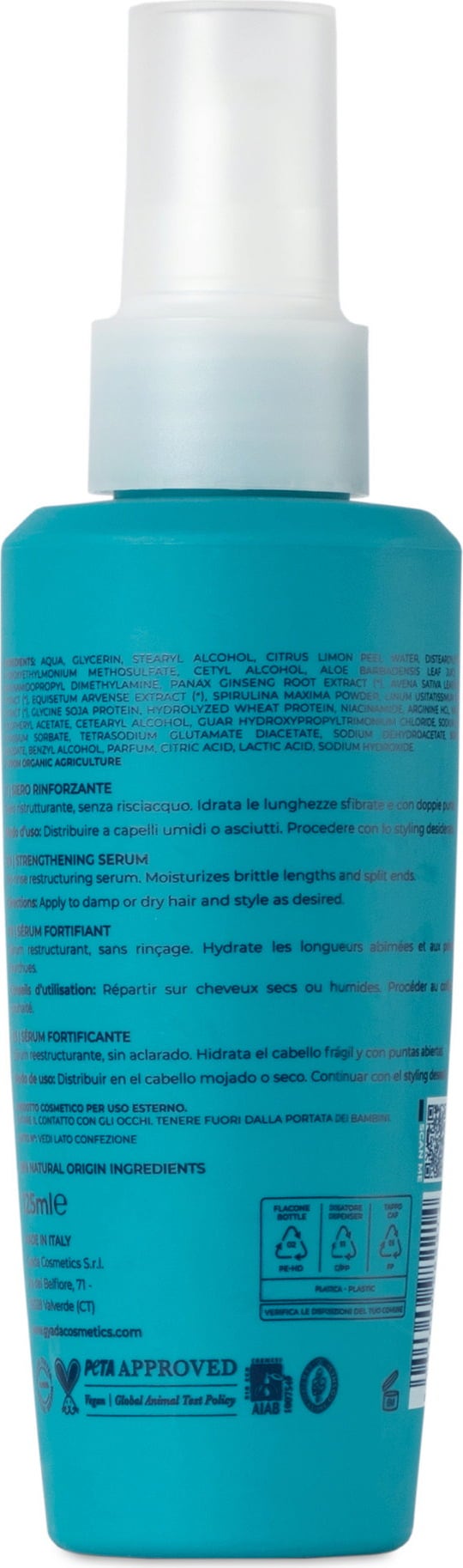 Das Serum enthält eine restrukturierende pflanzliche Mischung aus Spirulina (Algen, die reich an Mineralsalzen, Vitaminen sowie Aminosäuren sind), Hafer, Ginseng und Schachtelhalm, kombiniert mit Zitronenhydrolat, das für Glanz sorgt sowie feuchtigkeitsspendenden und schützenden Proteinen aus Weizen sowie Soja.