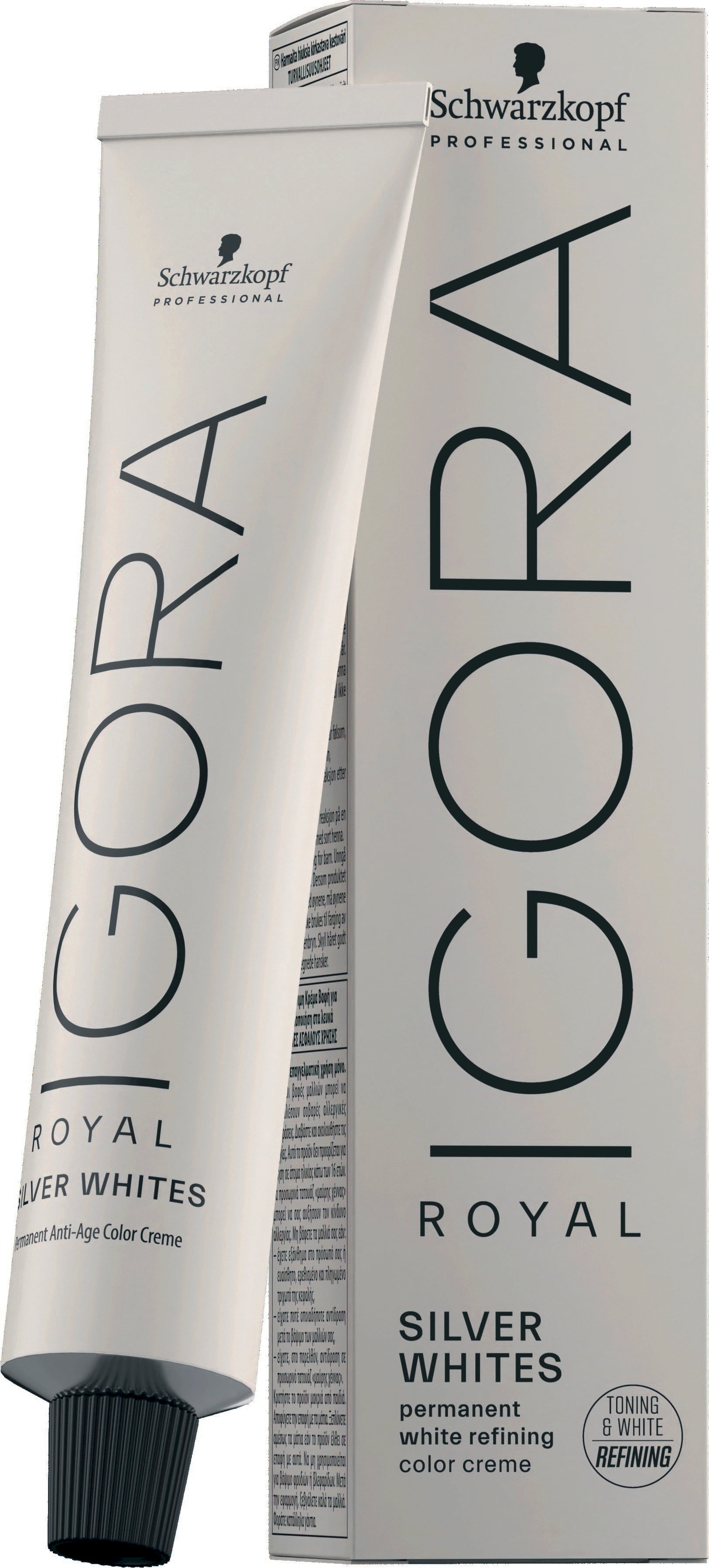 Igora Royal Absolutes Silverwhite von Schwarzkopf Professional unterstützt die Natürlichkeit von ergrautem Haar und verleiht ihm feine Nuancen. So bietet es reifem, unbehandeltem Haar, graues Haar zu veredeln. Die facettenreichen Silbervarianten in Dove Grey, Grey Lilac, Slate Grey und Silver halten bis zu 25 Haarwäschen. Dabei verwöhnen sie reifes Haar mit Pflege und mehr Glanz. Die cremige Tönung unterstreicht die natürliche Schönheit von grauem Haar und neutralisiert Gelbstich. Das Ergebnis ist weicheres und schimmernd seidiges Haar.
