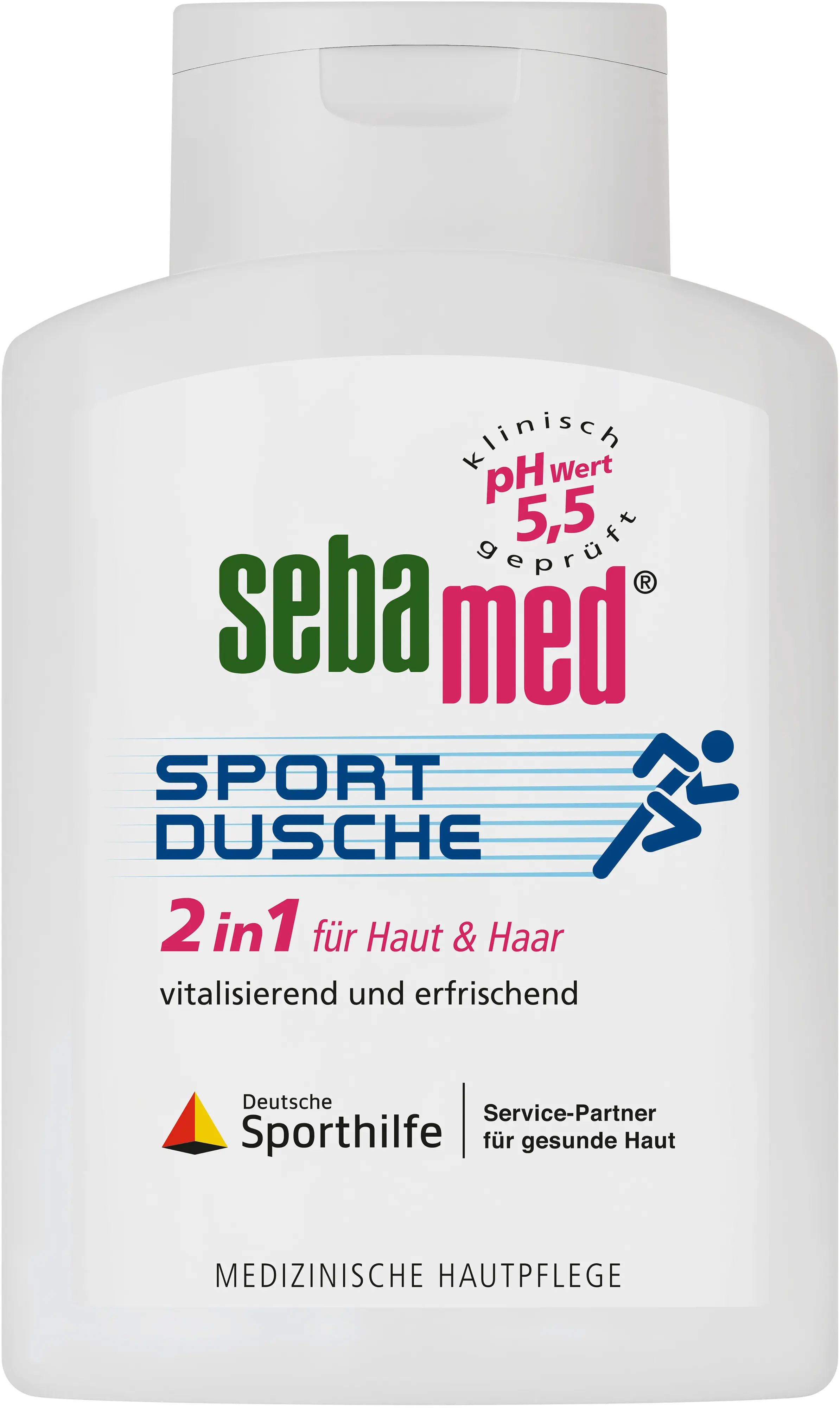 Die 2in1 Sport Dusche von sebamed reinigt sowohl deine sensible und strapazierte Haut am Körper als auch dein Haar zuverlässig und schonend nach jeder Sporteinheit. Sofort erhältst du ein erfrischtes und vitalisiertes Hautgefühl. Die Formulierung hat einen hauteigenen pH-Wert von 5,5 und unterstützt dadurch sogar den natürlichen Schutzmantel deiner Haut.