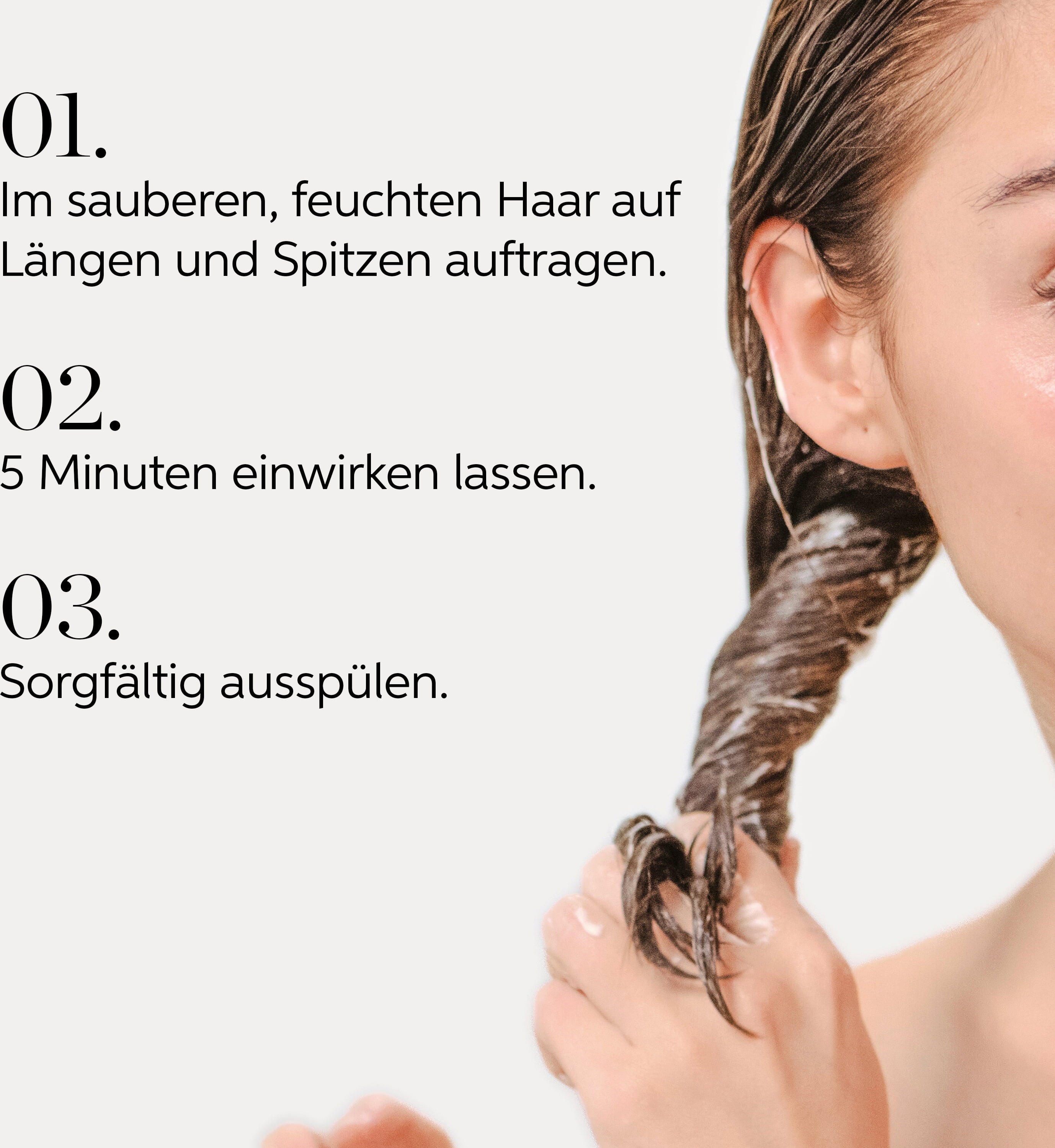 | Anwendung: | Arbeite die Maske sorgfältig ins feuchte Haar ein. Nach einigen Minuten Einwirkzeit kannst du die Maske wieder gründlich auswaschen. |