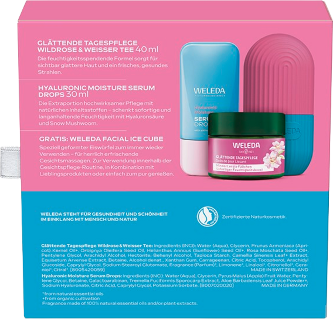 Das Geschenkset YOUR BEAUTY ID enthält eine Extraportion effektive Pflege mit natürlichen Inhaltsstoffen. Es besteht aus den Hyaluronic Moisture Serum Drops als Feuchtigkeits-Booster sowie der Wildrose & Weißer Tee Glättende Tagespflege. Abgerundet wird das Set mit dem wiederverwendbaren Facial Ice Cube.