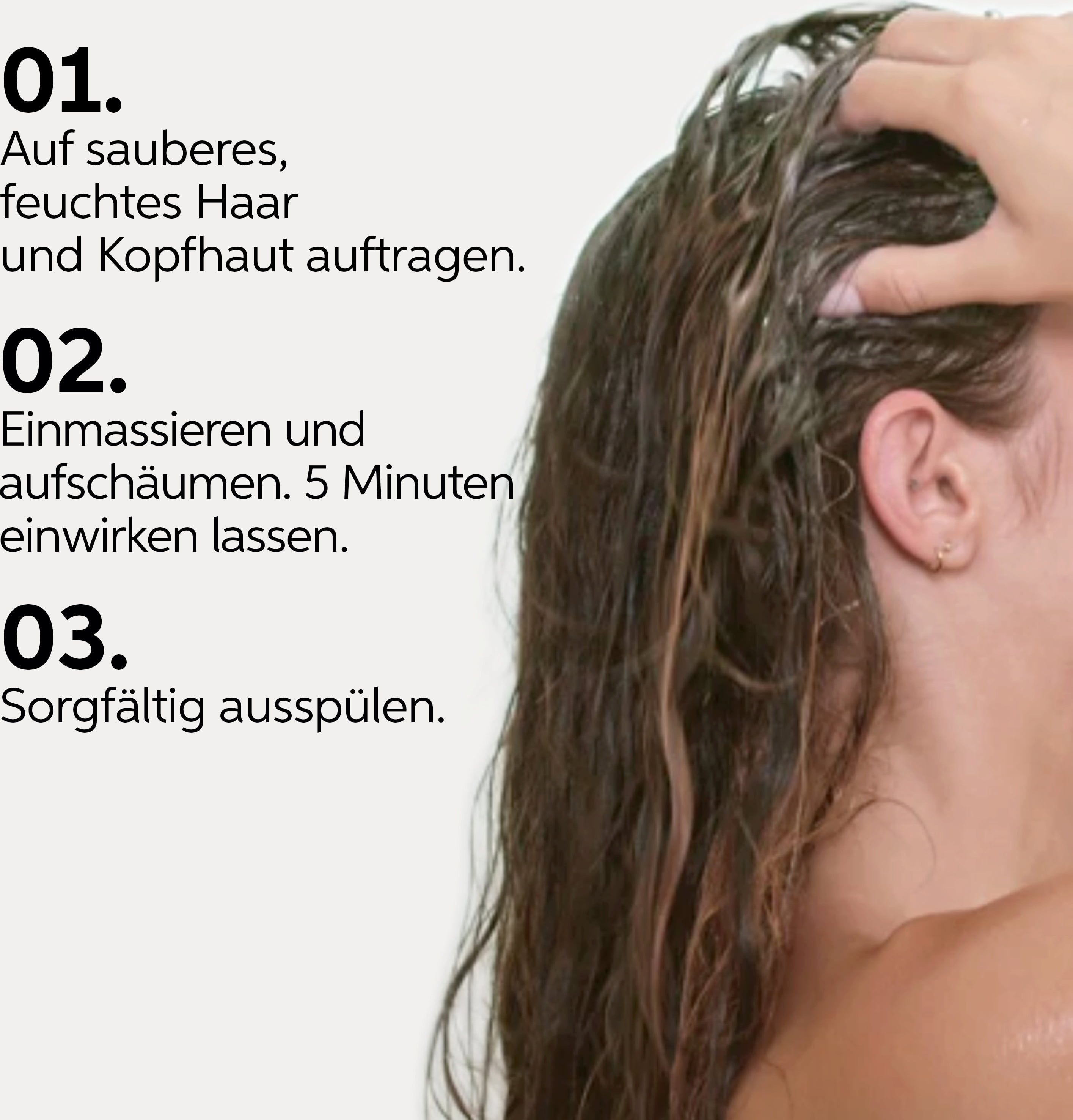Nach dem Waschen anwenden. In die Kopfhaut und das Haar einmassieren und 5 Minuten einwirken lassen. Ausspülen.